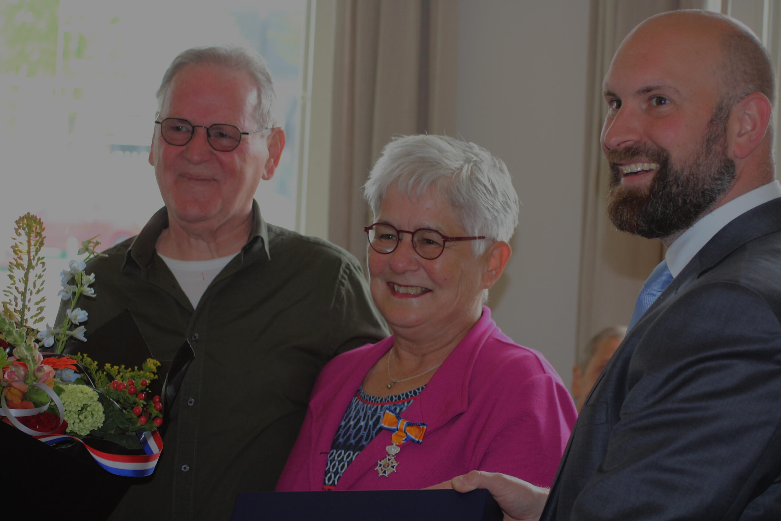 Joke van Baal met onderscheiding, links haar man Frans van Baal, rechts locoburgemeester Boaz Adank. (foto collectie heemkundekring)
