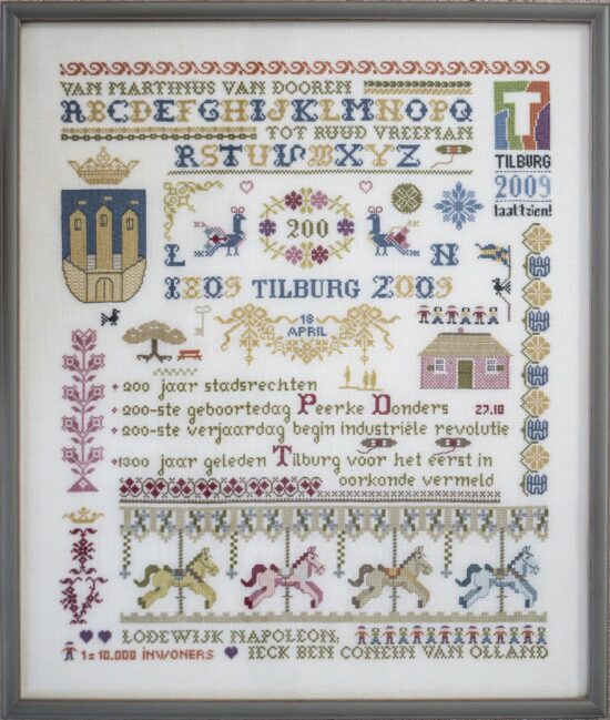 In 2009 vierde Tilburg uitgebreid dat het 200 jaar stadsrechten had. Speciaal voor die gelegenheid maakte mevrouw Ine Panis-Vermeer destijds een merklap met allerlei Tilburgse verwijzingen: het stadslogo, het huisje van Peerke Donders, het Tilburg-2009 logo, de lindeboom, kermispaarden, een schietspoeltje en uiteraard de jaartallen 1809-2009. Zoals dat hoort op een merklap, zijn er ook bloempatronen, versierde randen, letters en poppetjes op te vinden.