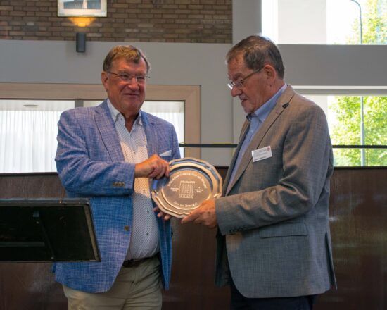 foto boven: Henk Hellegers reikt het tinnen herinneringsbord uit aan vice-voorzitter Carel Verdonschot. (foto collectie erfgoedvereniging Son en Breugel)