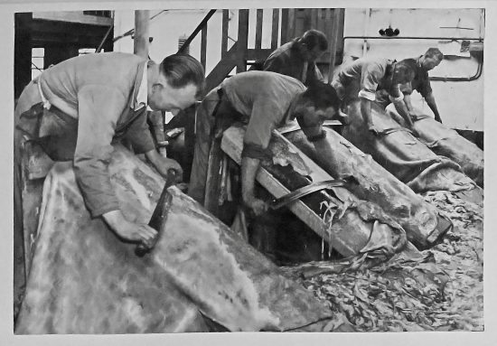 Foto Het handmatig ontvlezen van huiden in de leerlooierij van Van Wagenberg – Festen was een zwaar en nauwkeurig werk. Collectie HKK Onsenoort