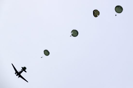 Parachutespringen in Son door het internationale Round Canopy Parachuting Team RCPT in authentieke uniformen