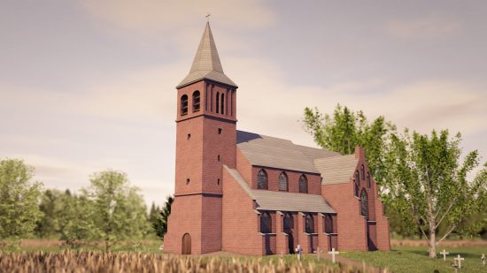 Bij de foto: Reconstructie van de middeleeuwse kerk op Het Hof in Lieshout.