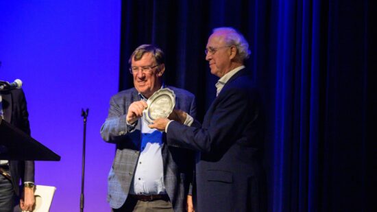 Foto: Henk Hellegers, voorzitter van Brabants Heem overhandigde aan Gerard van de Moosdijk een tinnen herinneringsbord. (foto collectie Heemkundekring De Vonder)