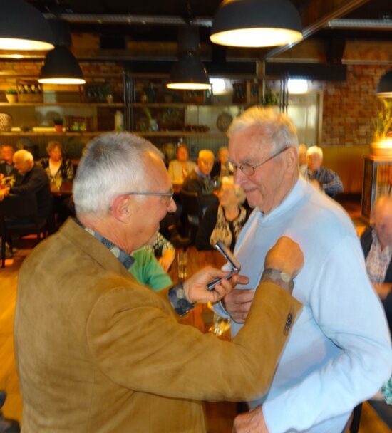 Foto: Ad Jacobs speldt de onderscheiding op bij Wout Timmers (foto heemkundekring Op dfe Beek)